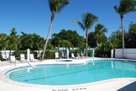 The spacious island club pool offers sunny seating for catching some rays as well as shady spots nestled beneath the swaying palm trees.